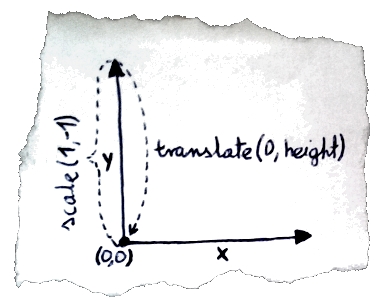 Luckily canvas lets you make changes to coordinate system by means of transformations. Two transformation methods will be useful for us: translate(x ,y) and scale(x, y). The former allows us to move origin to an arbitrary place, the latter is for changing size of drawn objects, but it may also be used to invert coordinates.
