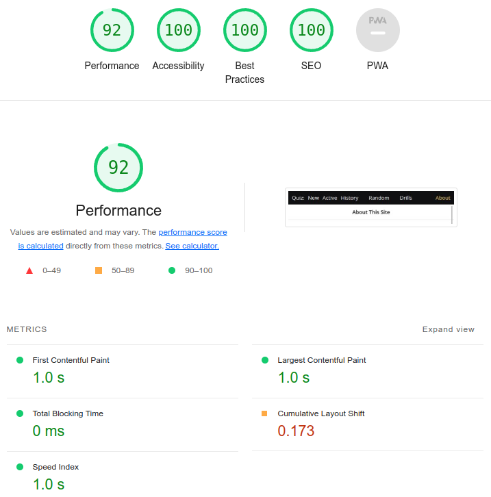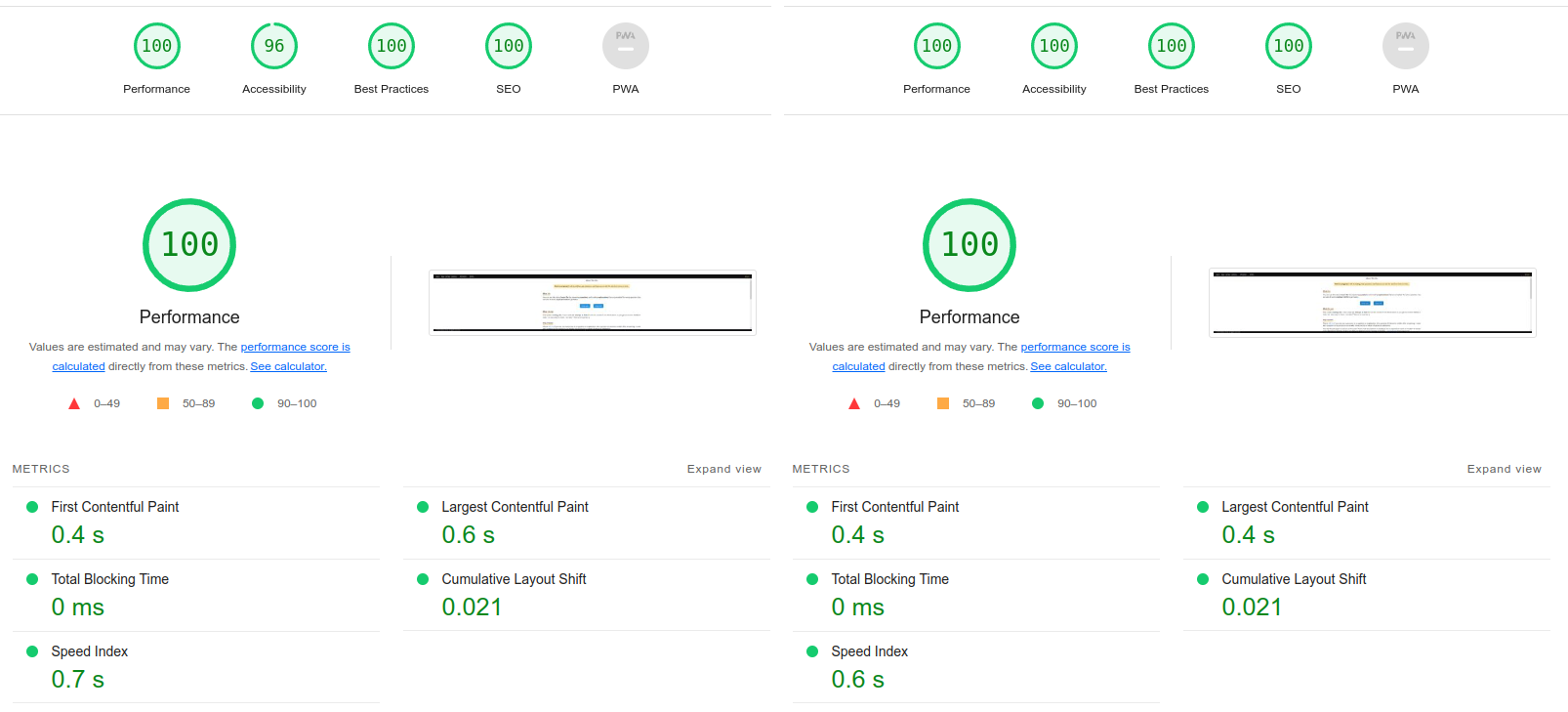 What about the deployed application? Unfortunately I don’t have data from CRA before updating React so here are the Lighthouse (navigation/desktop with forced clear storage) scores from CRA on React 16.9.0 (left) and Vite on 18.0.2 (right):