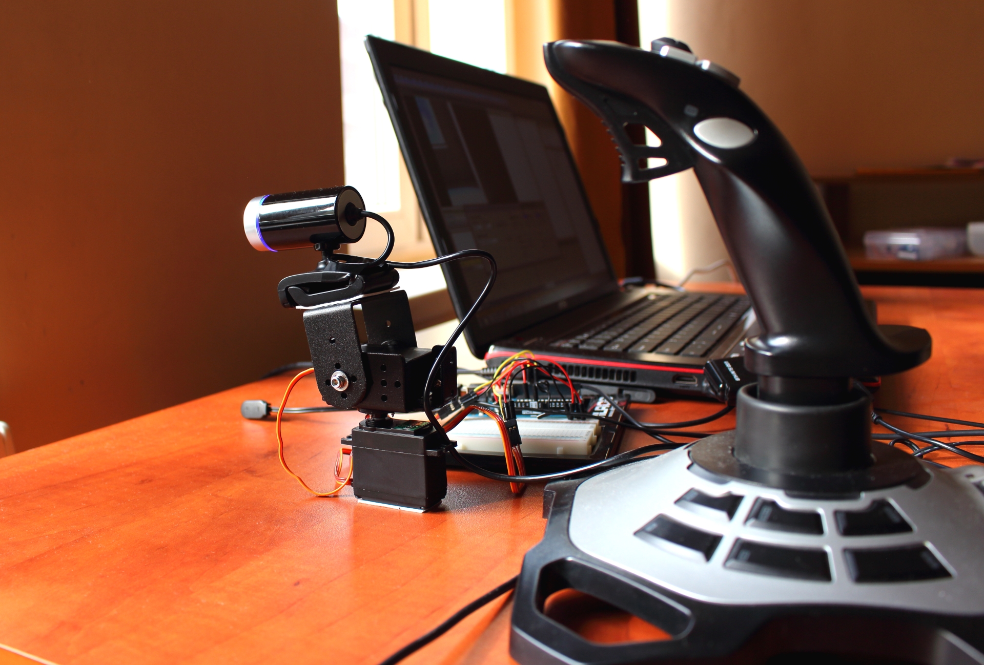 How it works? Short version: joystick (in my case Logitech Extreme 3D Pro) is connected to laptop with Windows 7 via USB. Desktop application (.NET 4.5/WinForms) uses SharpDX library (managed DirectX API) to pull position information from joystick. This info is presented in numerical and graphical way on UI (C# 5.0 async helps here). Joy position is then translated into desired pan&tilt servo angles and that data is sent to Arduino Uno through serial port. Arduino receives the data, and thanks to its Servo library, commands servos to move…