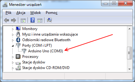 allowes Arduino to talk to PC (in my case a laptop with Windows 7) over serial port. That’s right, even though Arduino Uno is connected to computer via USB cable it actually uses COM port to communicate. On my machine its called “COM3” (screen shown below comes from Device Manager - my Windows is in Polish):