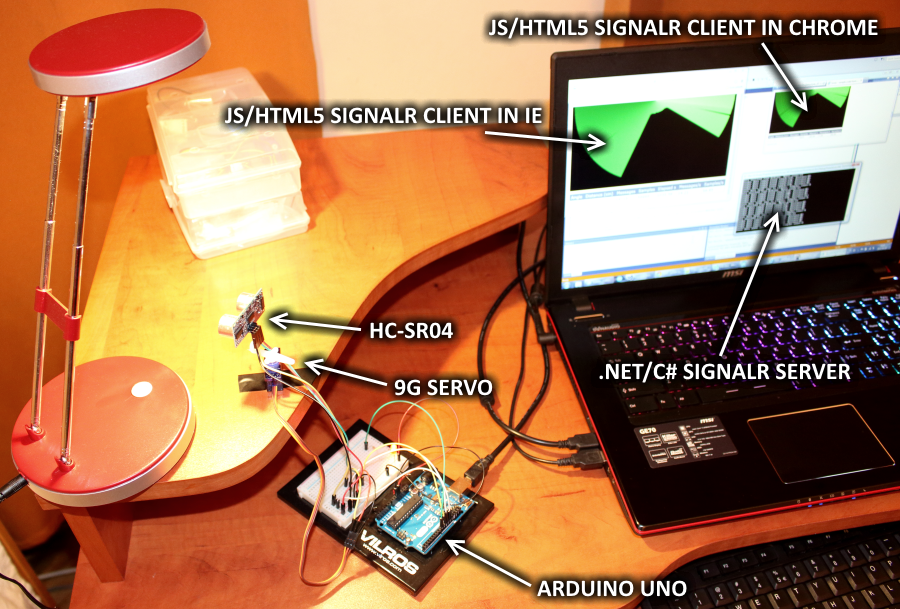The basic idea goes like this: HC-SR04 sensor measures time it takes an ultrasonic signal to bounce from obstacles and this gives as a chance to calculate distance to these obstacles. Position of the sensor is controlled by servo. Information about distance to objects and direction in which the sensor is pointing is sent to PC that is running console application with SignalR sever. PC receives the data and sends it to JavaScript clients that are capable of presenting sonar data in nice visual way using HTML5 canvas element…