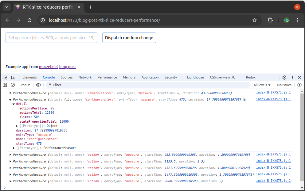 When “Setup store …” button is clicked, the application uses createSlice function to make slice reducers with requested amount of actions. Each reducer manages a state that contains numerical properties. The amount of properties matches the amount of actions. Each generated action is designed to control single state property. The count of slices and actions per each slice is controlled by SLICES_COUNT and ACTIONS_PER_SLICE_COUNT constants. On the published version of the app these are set to 500 and 25 respectively, which gives a total of 12.5K actions. Once the slices are defined, the store is created with a call to configureStore and a subscription to store changes is added. When “Dispatch random change” button is pressed, a single action is dispatched to modify single value in one of the state slices…