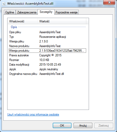 It contains two attributes: AssemblyVersion and AssemblyFileVersion along with a comment that describes numbering pattern recommended by Microsoft. We will also use another attribute: AssemblyInformationalVersion which is not added by default. AssemblyVersion sets version number that is recognized by .NET for dependency resolution. AssemblyFileVersion is used for file version as seen by Windows and AssemblyInformationalVersion is meant more for human consumption as it can contain strings (we will make use of it for holding Git commit hash)… Detailed description of the meaning of these attributes is outside scope of this post but check this great SO answer if you want to know more.