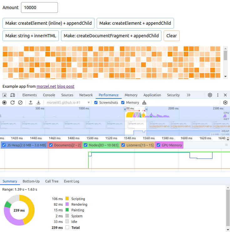 I’ve clicked a bit and to be honest I haven’t noticed a significant difference that would justify switching from simplest createElement + appendChild to using innerHTML or createDocumentFragment… But, the buttons are there for you to try it yourself.